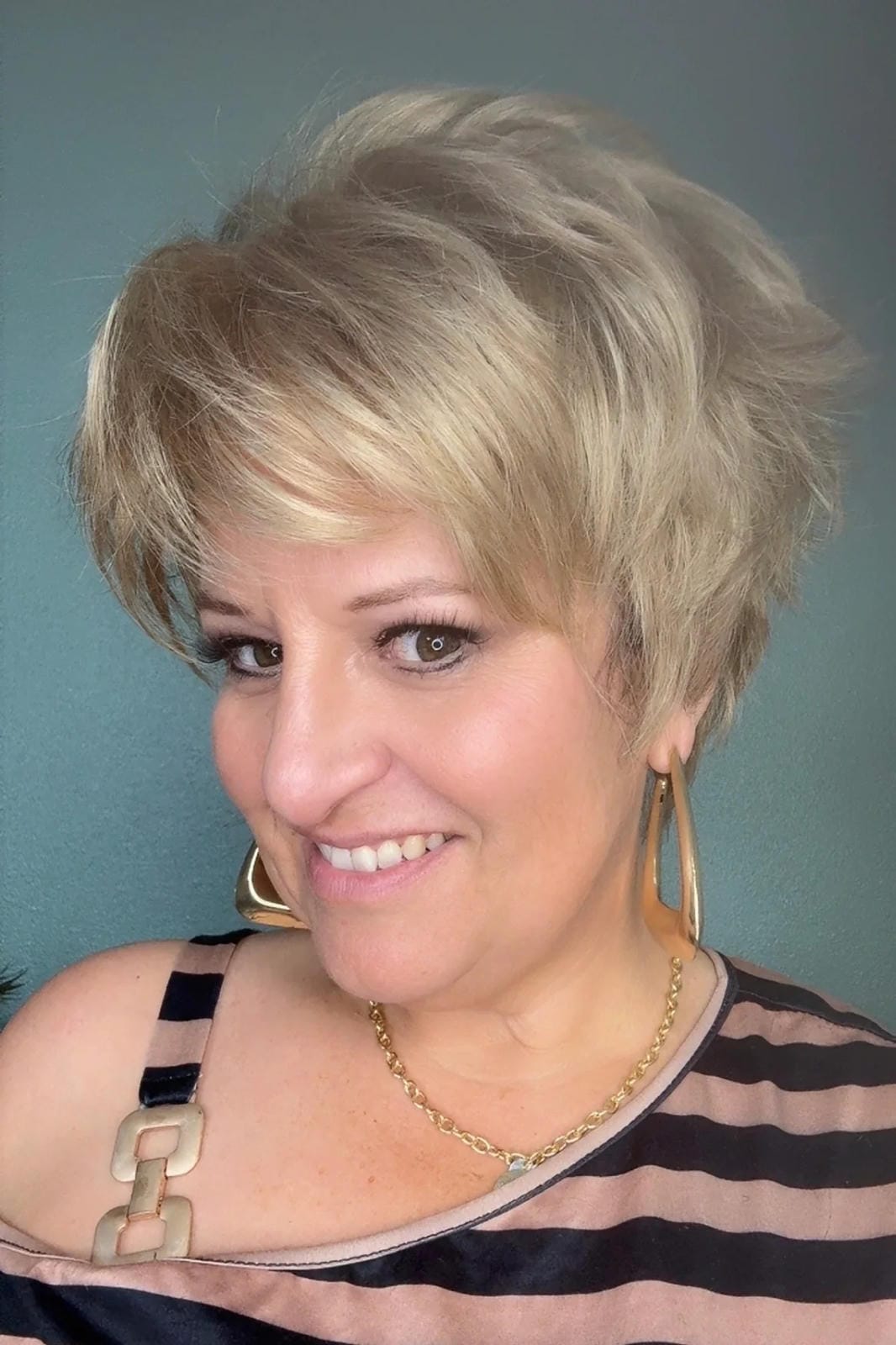A classy short, tousled look with rich texture. It can be worn tamed or ravenous. Features a double-layer mono top for a natural look and added styling versatility. The mono top is extremely soft and comfortable. The ready-to-wear synthetic hair looks and feels like natural hair.