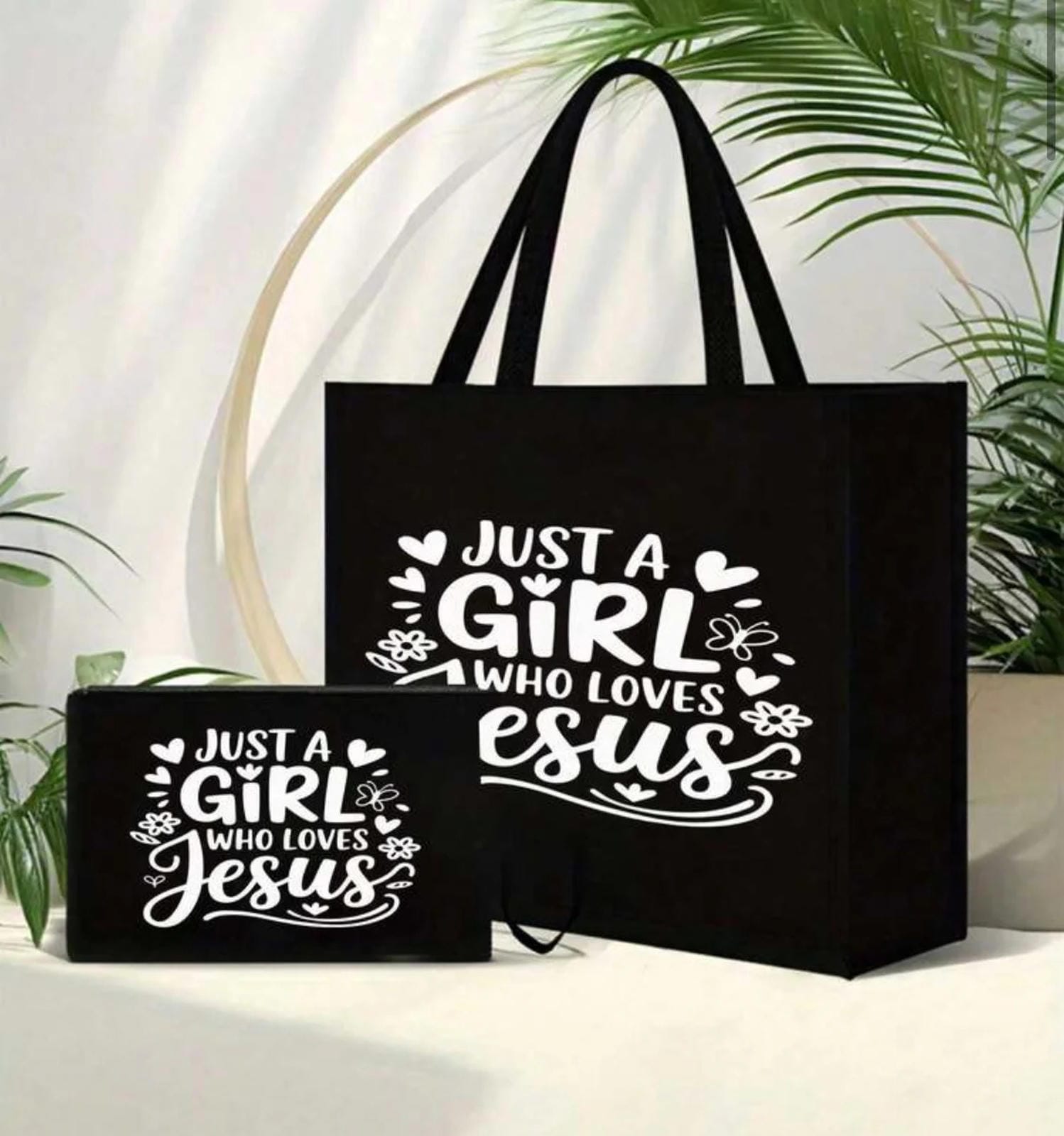 Large Black Canvas Tote 2 Piece Set– “Just a Girl That Loves Jesus”