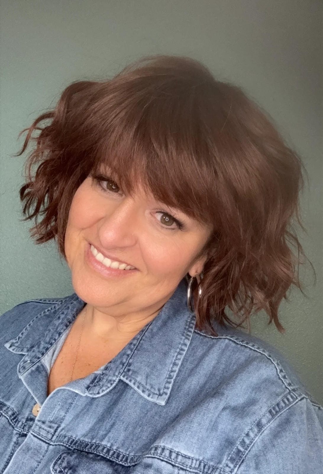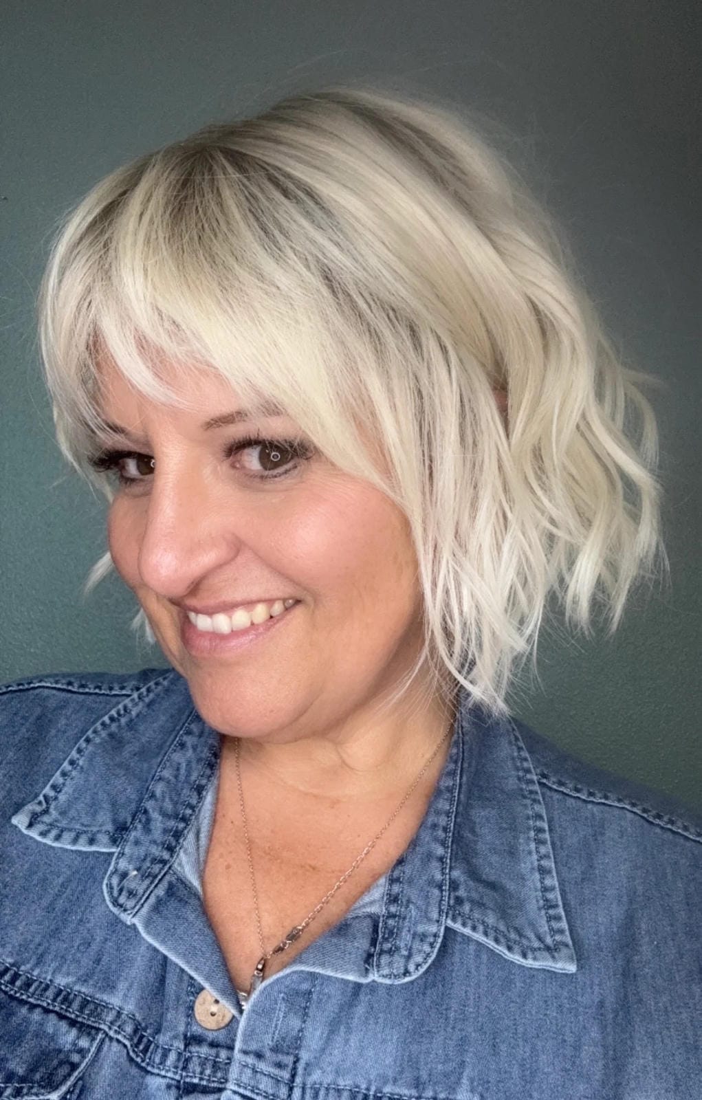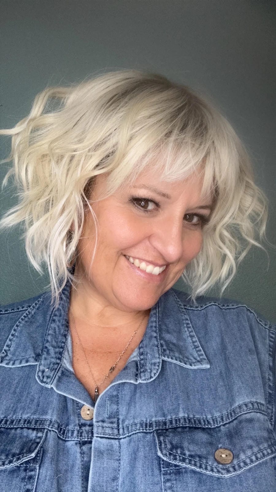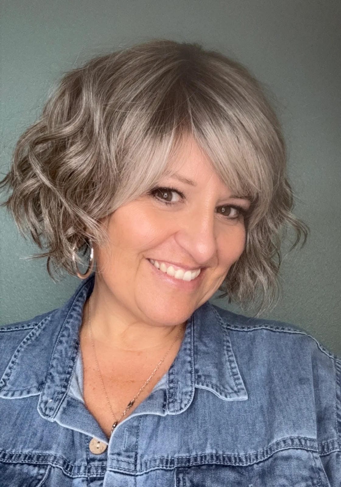 Short textured layers of beach waves, silky feathered bangs, a smooth silky top, and bob back that falls above the collar. Featuring a Sheer Comfort Mono Top and Soft Lace Front that is double hand knotted for weightless comfort. Ear-to-ear feathered bangs brush in any direction or off the face for an undetectable hairline and part.